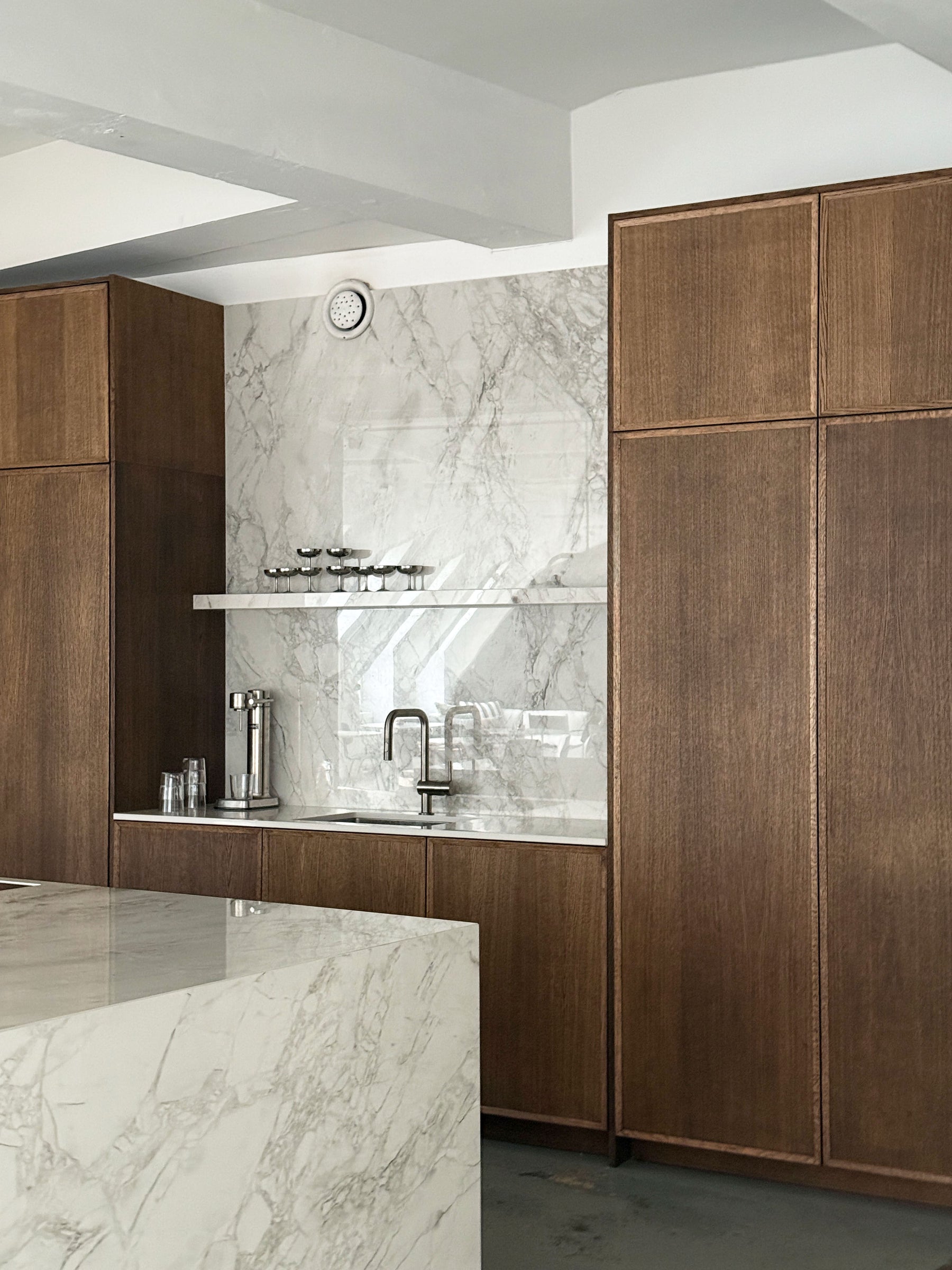 Brahen pelkistetty, moderni ilme syntyy yksityiskohdista. Massiivitammipaneelit jiiriliitoksilla luovat monivivahteista kerroksellisuutta ja geometriaa.